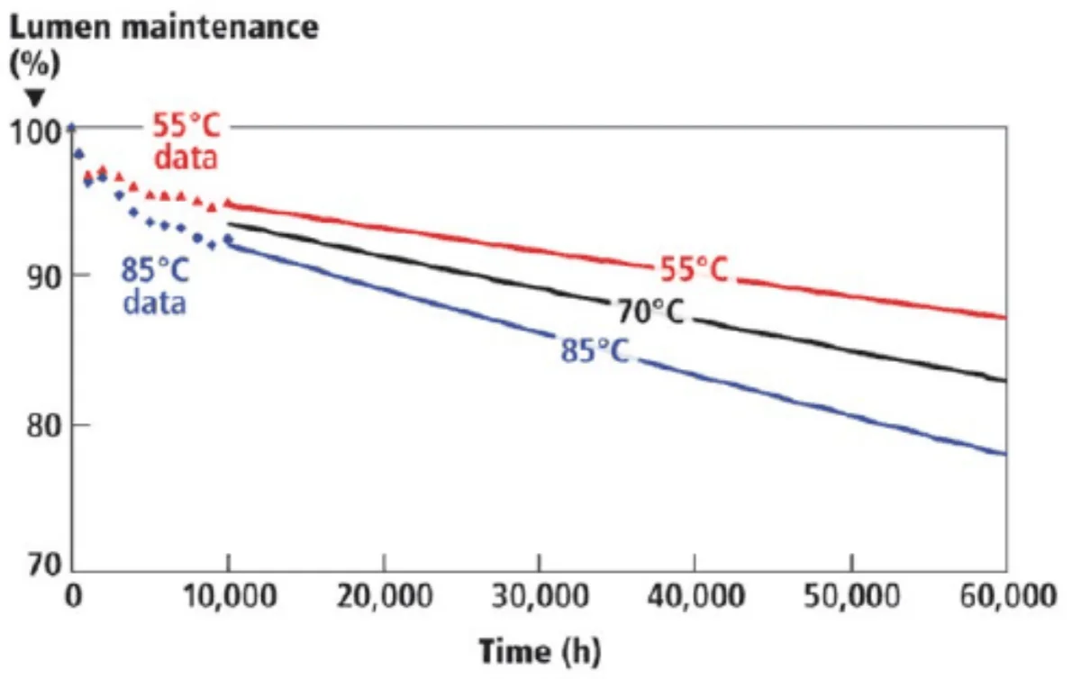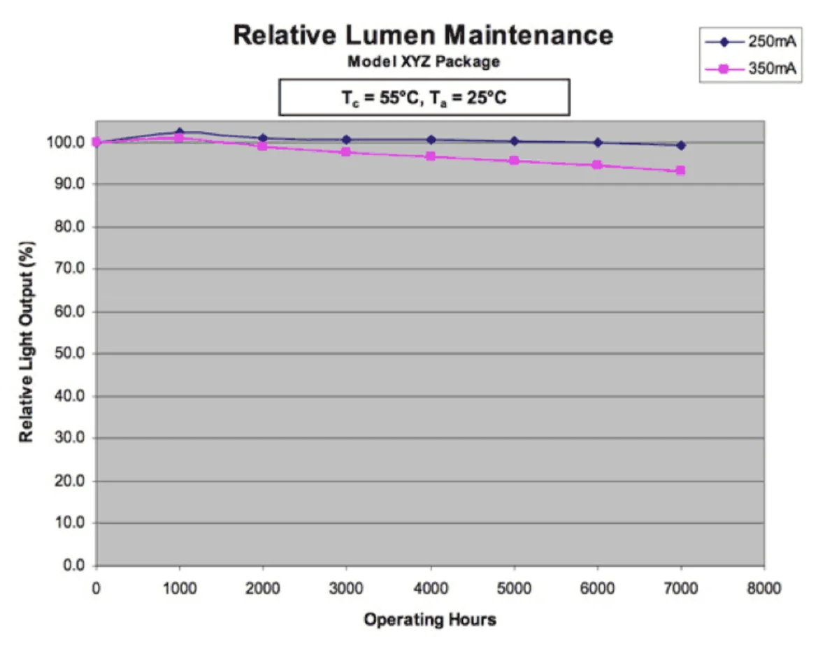 During the LM-80 test, output intensity from the LED is recorded at various temperatures and input currents. Data must be collected at increments of no less than 1,000 hours, and for a total duration of at least 6,000 hours (although 10,000 hours of test time is recommended). The graph below shows a typical LM-80 light level maintenance result.