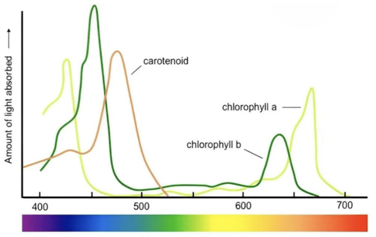 The graph illustrates the primary light receptor in plants. Chlorophyll a is the main pigment responsible for capturing light energy and converting it into chemical energy during photosynthesis (Taiz & Zeiger, 2010). Chlorophyll b plays a complementary role by absorbing light at different wavelengths and transferring that energy to chlorophyll a, broadening the spectrum of light used (Lichtenthaler, 1987). Carotenoids contribute by protecting plants from light-induced damage, absorbing wavelengths that chlorophylls cannot, and transferring this energy to support photosynthesis (Britton, 1995), promoting better growth and resilience.